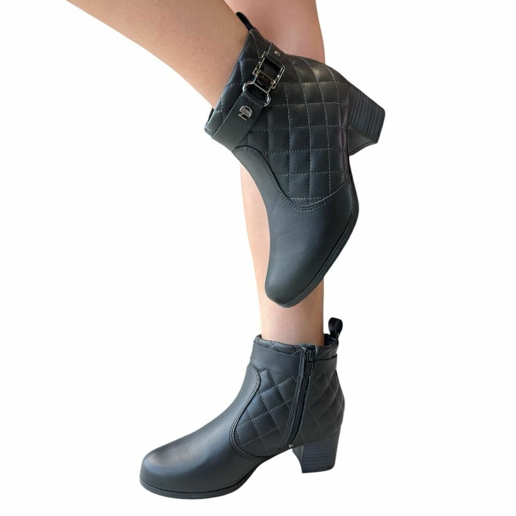 A bota conta com uma tira decorativa ao redor do tornozelo, com uma fivela metálica em grafite que realça o visual. O fechamento é por zíper lateral, facilitando o calce e proporcionando mais praticidade.