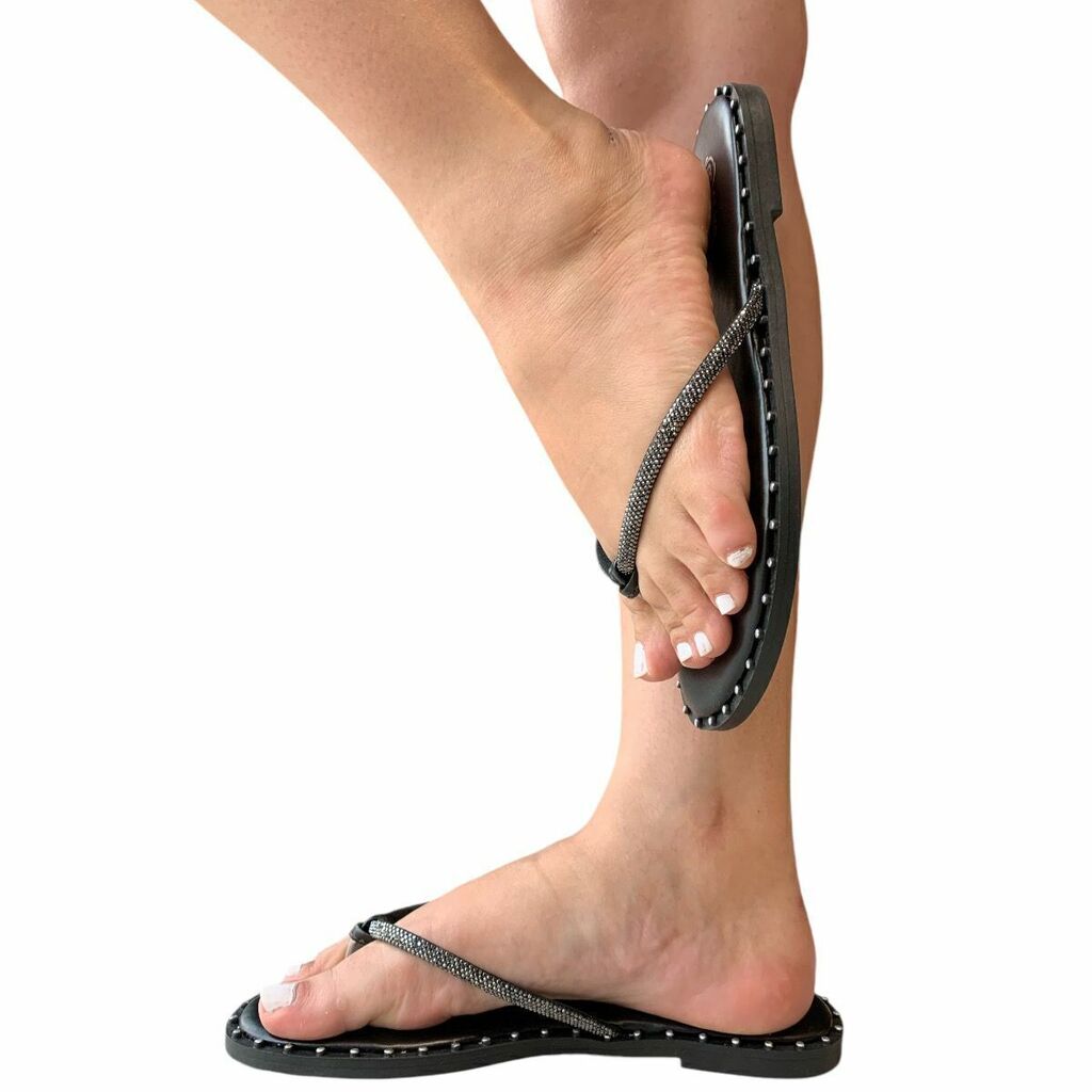 Esse chinelo, possuí tira em strass preto, forrado em tecido. Sua palmilha possuí espuma de 3 mm de espesura e forrada em tecido para proteger seu pé durante uso.
