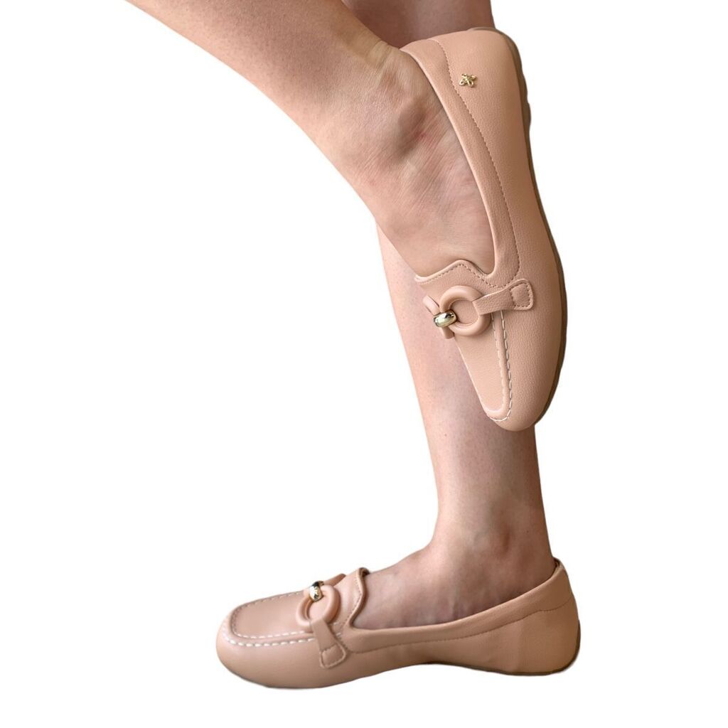 Mocassim feminino em tom nude rosado, confeccionado em material sintético de alta qualidade, com acabamento texturizado e costura aparente no cabedal para um toque artesanal. Possui detalhe frontal em argola revestida no mesmo material e tom do calçado, com aplicação metálica dourada, agregando sofisticação ao design. O modelo conta ainda com pequeno aplique lateral em metal dourado, conferindo charme discreto. Interior macio e palmilha acolchoada garantem conforto durante o uso, enquanto o solado emborrachado oferece estabilidade e segurança na pisada. Ideal para compor looks elegantes e casuais com praticidade.