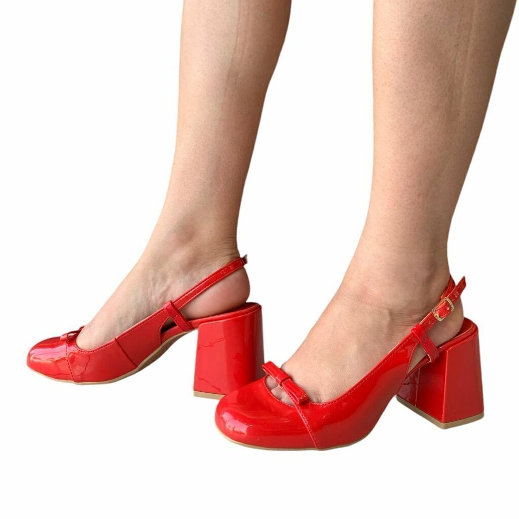 Esse SLINKBACK é um sapato fechado aberto atrás tem tirinha no calcanhar com fivela ajustável, sua frente o bico é levemente redondo bem retrô e um lacinho que da todo charme ao modelo.