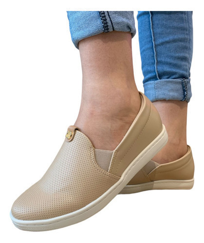 Feito em material Napa sintético de alta qualidade, Bico arredondado, seu cabedal possui microperfuros, com detalhe com logo da marca em metalizado Dourado, possui elásticos nas laterais permitindo um ajuste perfeito aos pés, proporcionando praticidade no calce.
