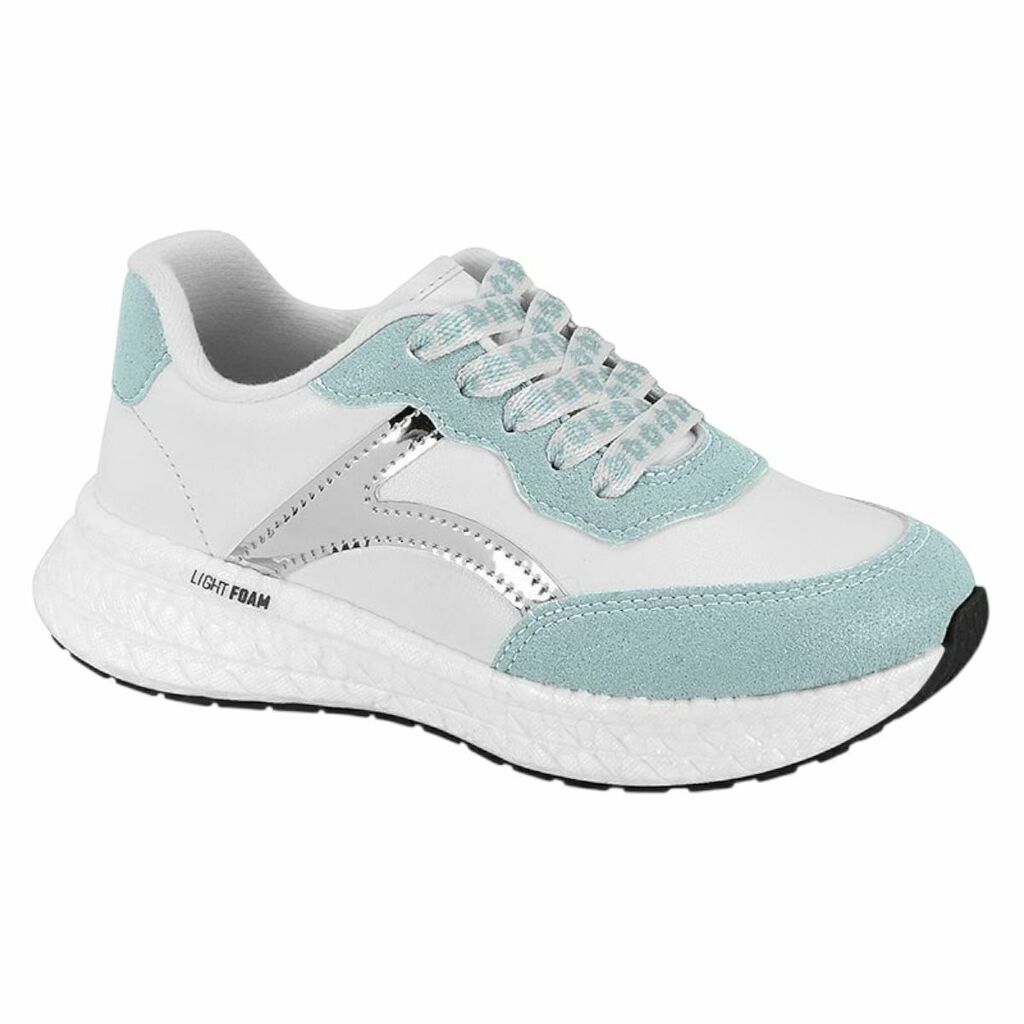Tênis feminino infantil casual com design moderno e versátil, ideal para o dia a dia. Confeccionado em material sintético de alta qualidade com detalhes em sintética azul-claro com glitter, conta com recortes metalizados prateados que dão um toque fashion. Possui cadarço bicolor com desenho de flores e palmilha macia para maior conforto. O solado em E.V.A com tecnologia Light Foam garante leveza e excelente absorção de impactos, proporcionando mais comodidade durante o uso.