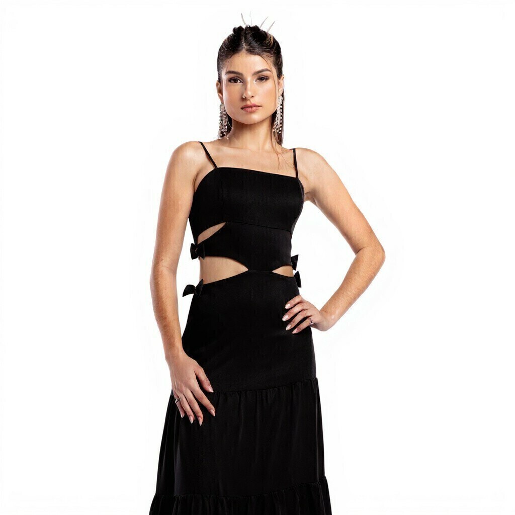 Este vestido longo é a escolha perfeita para quem busca sofisticação com um toque moderno. Confeccionado em tecido leve e fluido, ele apresenta alcinhas finas e recortes laterais estratégicos, adornados por delicados laços que valorizam a silhueta. A saia em camadas, modelo três marias, confere movimento e elegância.