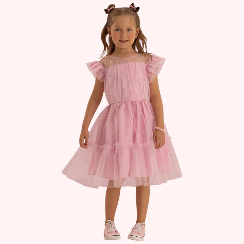 Com um design delicado, o modelo traz mangas de babadinhos em tule, saia rodada com camadas e leve brilho que garante um toque mágico e sofisticado, todo com uma camada de tule brilhante por cima, adicionando mais brilho para o look. Ideal para festas, aniversários, eventos ou até mesmo para looks cheios de charme no dia a dia.